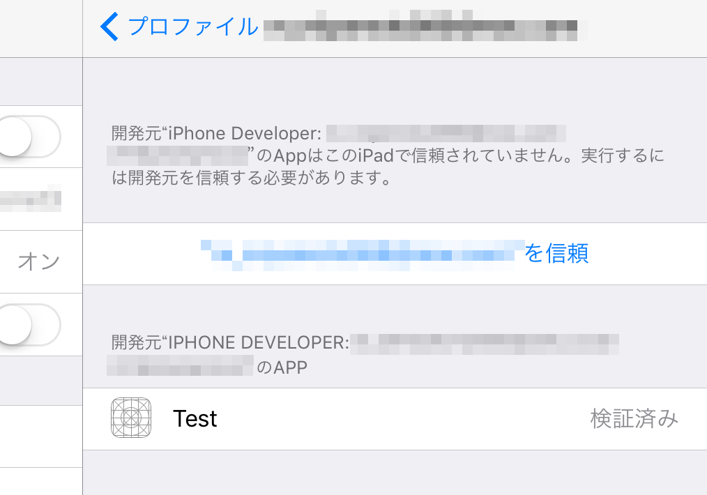 これは、iOSデバイス上で設定 => 一般 => プロファイル => 〜@mac.com(アップルID)を選ぶとこんな画面が出るので”〜を信頼”をタップすれば動くようになる。
