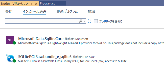 - NuGetを使ってMicrosoft.Data.Sqlite.CoreとSQLitePCLRaw.bundle_e_sqlite3をインストールする。